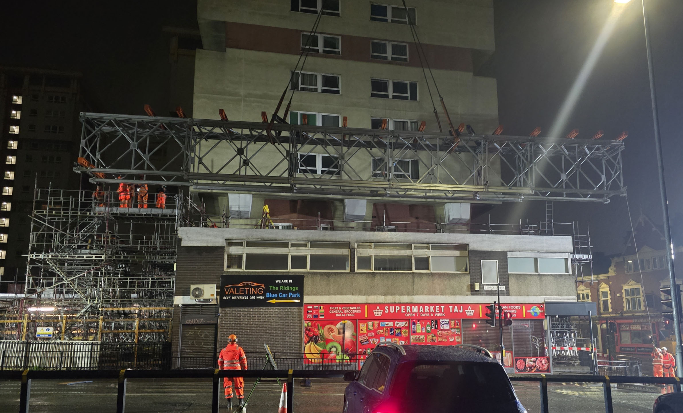 The city-centre location created significant technical challenges, with the buildings positioned above a live shopping precinct that had to remain fully operational. Due to strict loading limits on the roof and no option for back-propping, four heavy duty scaffold support towers were installed to each corner of the buildings. An RMD Truss system was then installed to span approx. 25m between the towers on the North and South elevations. These beams formed the primary foundation for the access scaffold above and were lifted into place by crane during a series of carefully planned night operations with temporary road closures.